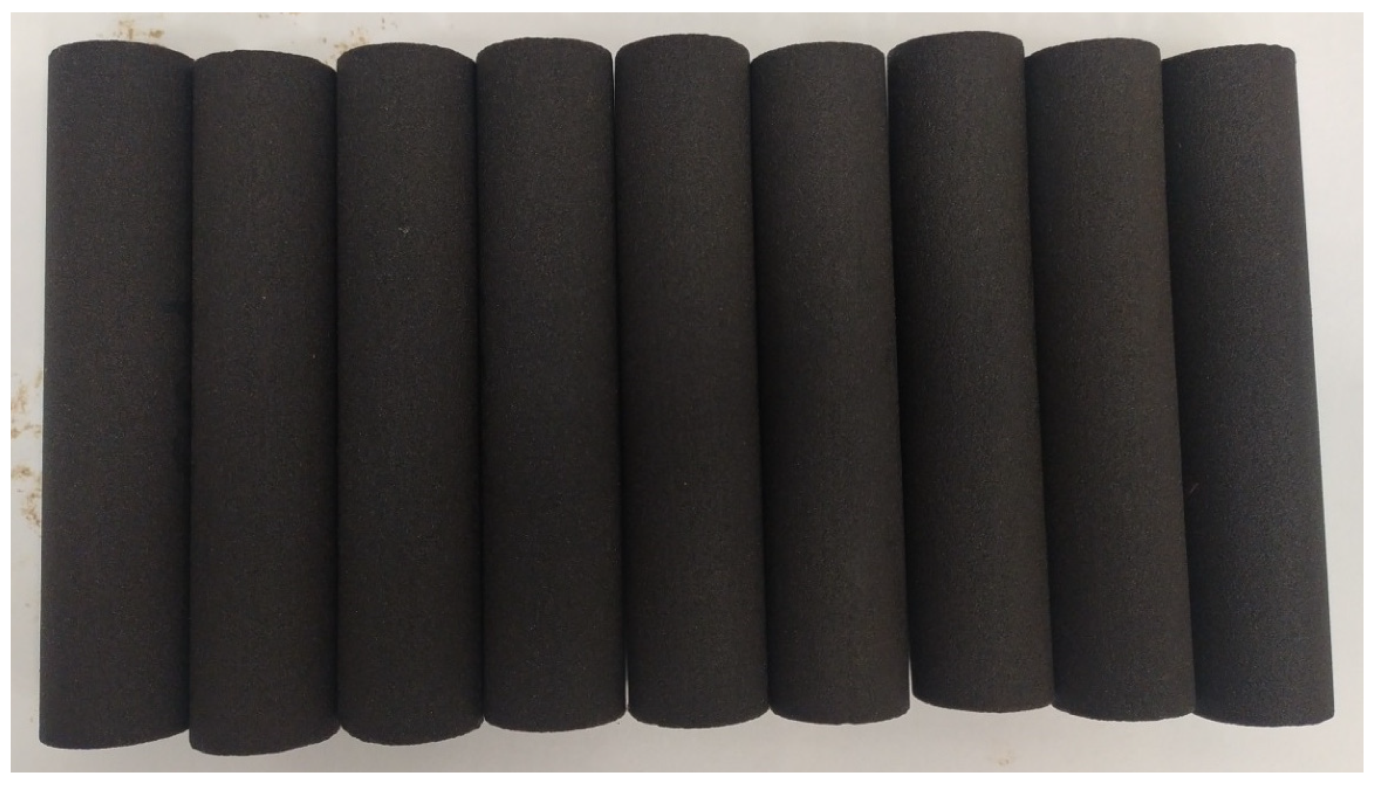 The use of these standardized rocks minimizes the impact of natural geological heterogeneity and ensures the comparability of results in international studies on fundamental flow processes. Core preparation included drying at 100 °C until constant mass was achieved to remove residual moisture and hydrocarbons. This was followed by precise measurement of geometric parameters, mass, and petrophysical properties (absolute porosity and gas permeability). Oil saturation was performed in a vacuum chamber for 48 h under controlled temperature and pressure. The pore volume (PV) and oil saturation level were determined gravimetrically after the process.