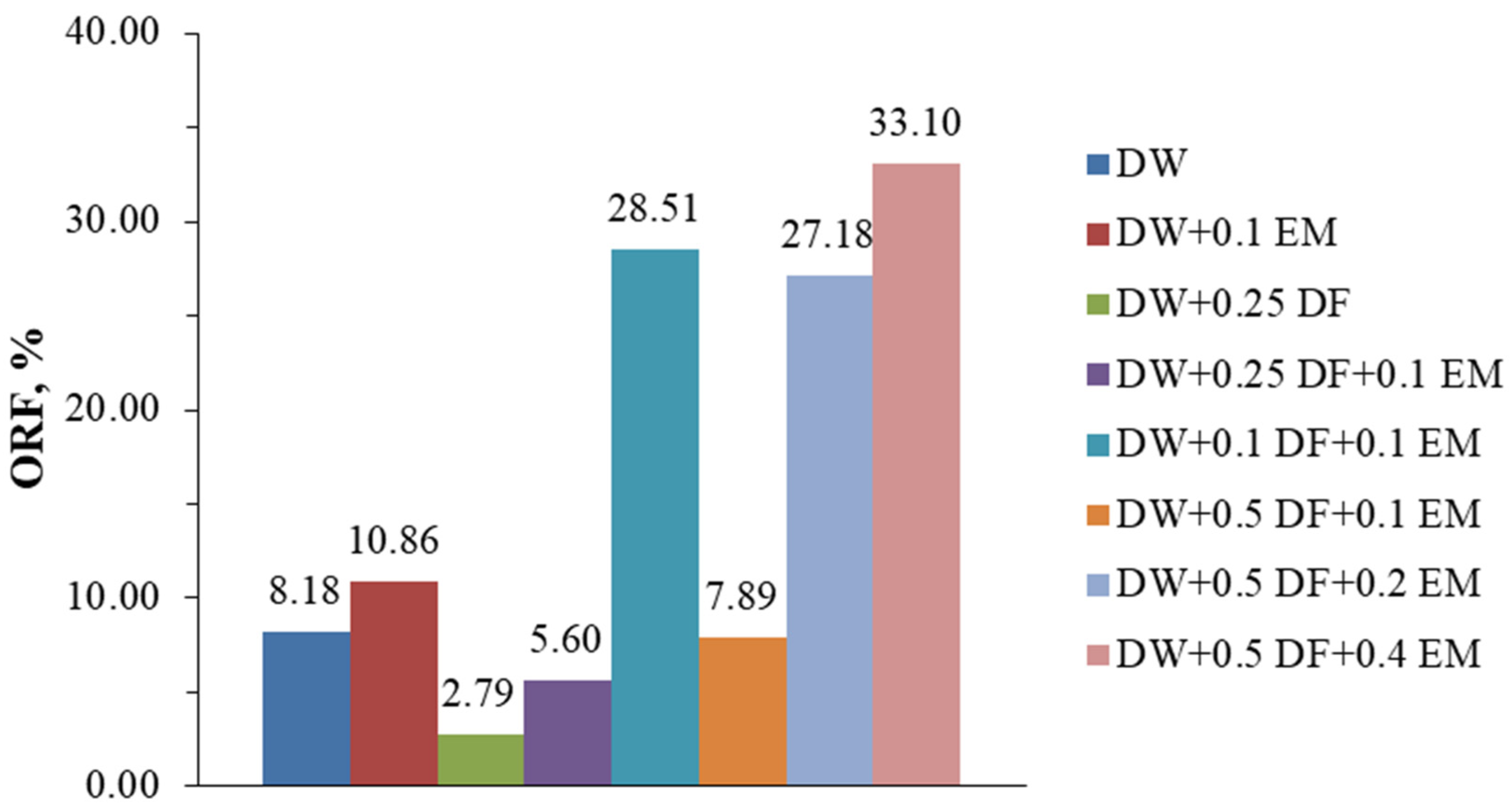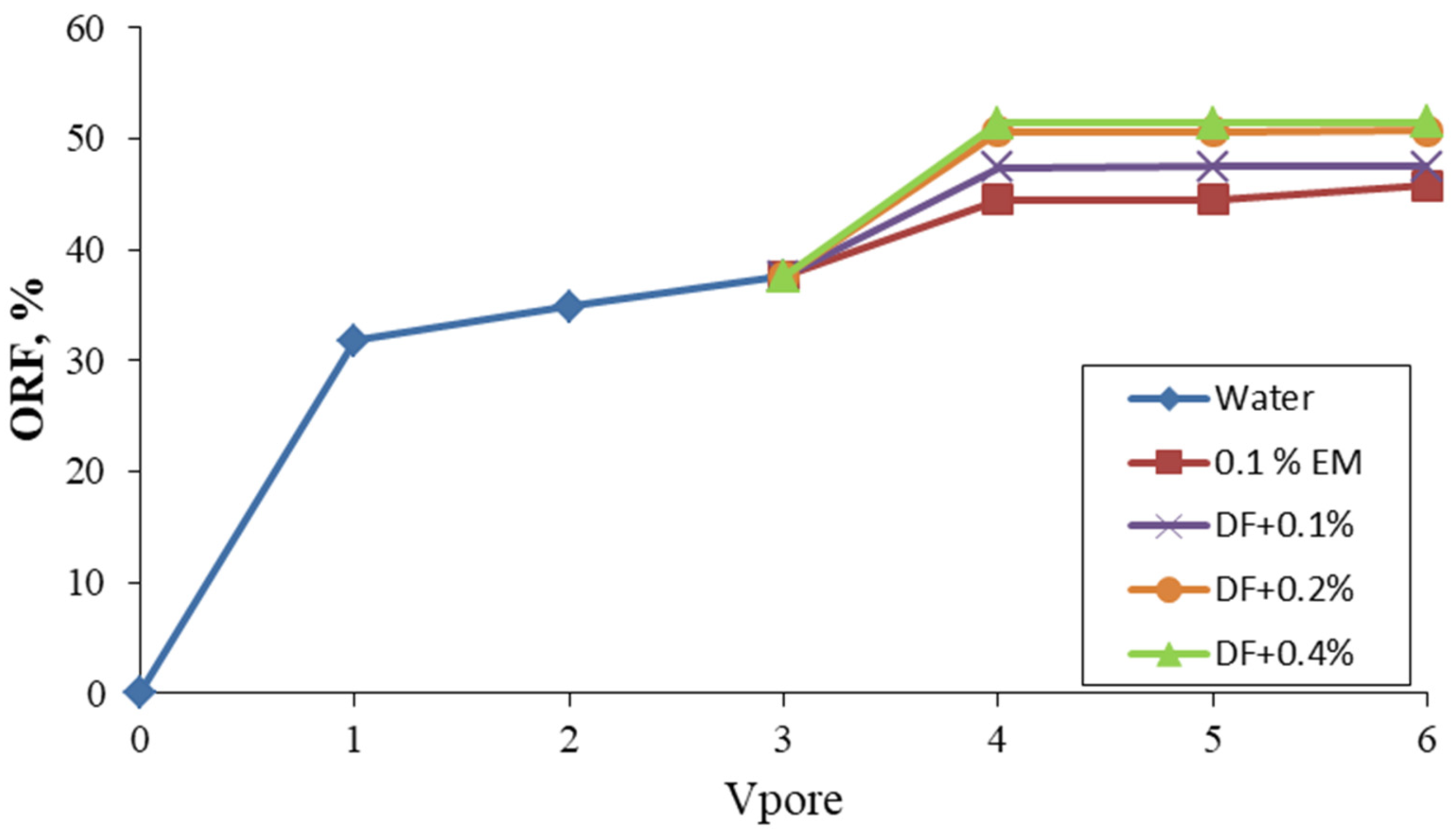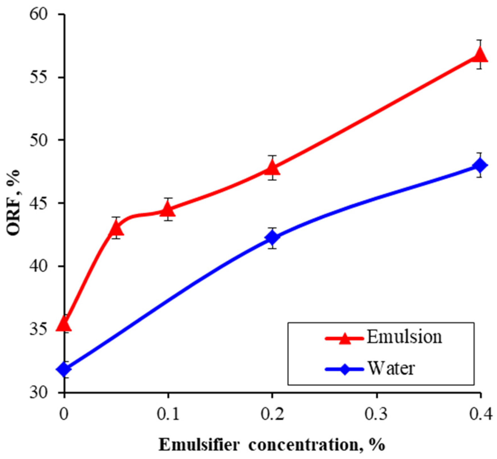 The maximum increase in ORF was obtained for an emulsion with an emulsifier content of 0.4%. For it, the total EOR after water injection leads to an increase in the ORF by 14.0%, and its minimum increase of 8.2% is observed when using a 0.1% aqueous emulsifier solution without the DF. Thus, it was shown that by itself, a similar addition of an emulsifier to water increases the recovery factor, but not as significantly as in the composition of the emulsion. The effect of increased EOR is associated with the presence of a hydrocarbon phase.
