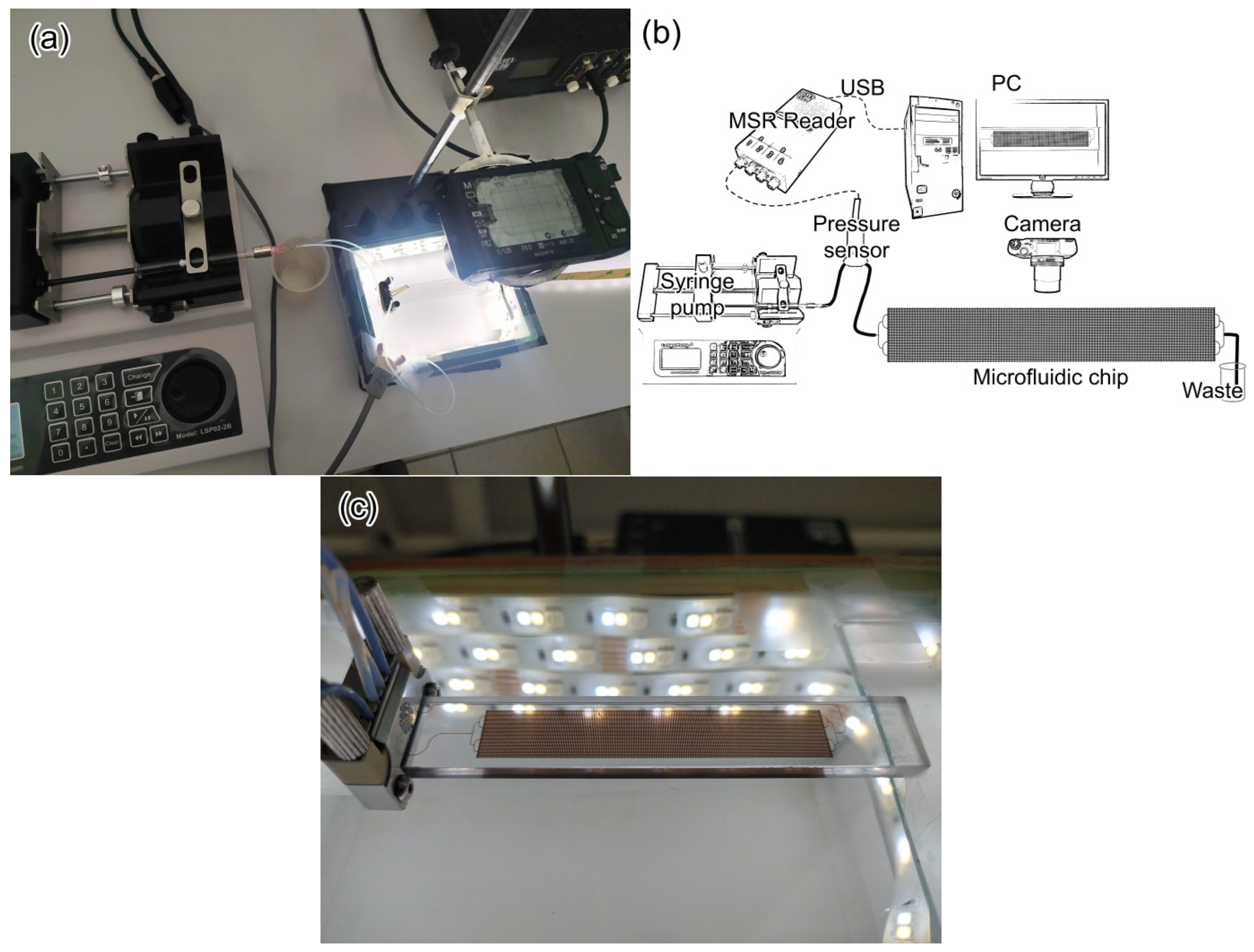 Figure 11, comprised a suite of high-precision instruments ensuring controlled test conditions. Precise fluid delivery was achieved using a two-channel syringe pump (model LSP02-2B)(Longer Precision Pump Co., Baoding, China), which maintained a stable flow rate in the microliter-per-minute range. The injection pressure was monitored in real time by a high-precision Elveflow pressure sensor with a measurement range from −15 to 30 psi (2068.2 mbar), featuring metrological characteristics that include an accuracy of ±0.2% of the full scale and high result repeatability. All displacement experiments were performed at conducted under standard ambient conditions (atmospheric pressure, temperature 25 °C). The injections were carried out at a constant flow rate of 0.5 μL/min. Pore-scale visualization of the displacement processes was provided by a high-speed camera, which recorded the fluid dynamics and displacement fronts. A set of image analysis techniques based on color space transformation and machine vision algorithms was employed to process the experimental results, enabling quantitative evaluation of the displacement parameters with minimal error. The integrity of the flow system was verified by reference tests, which confirmed the stability of the operating parameters throughout the entire experimental series.