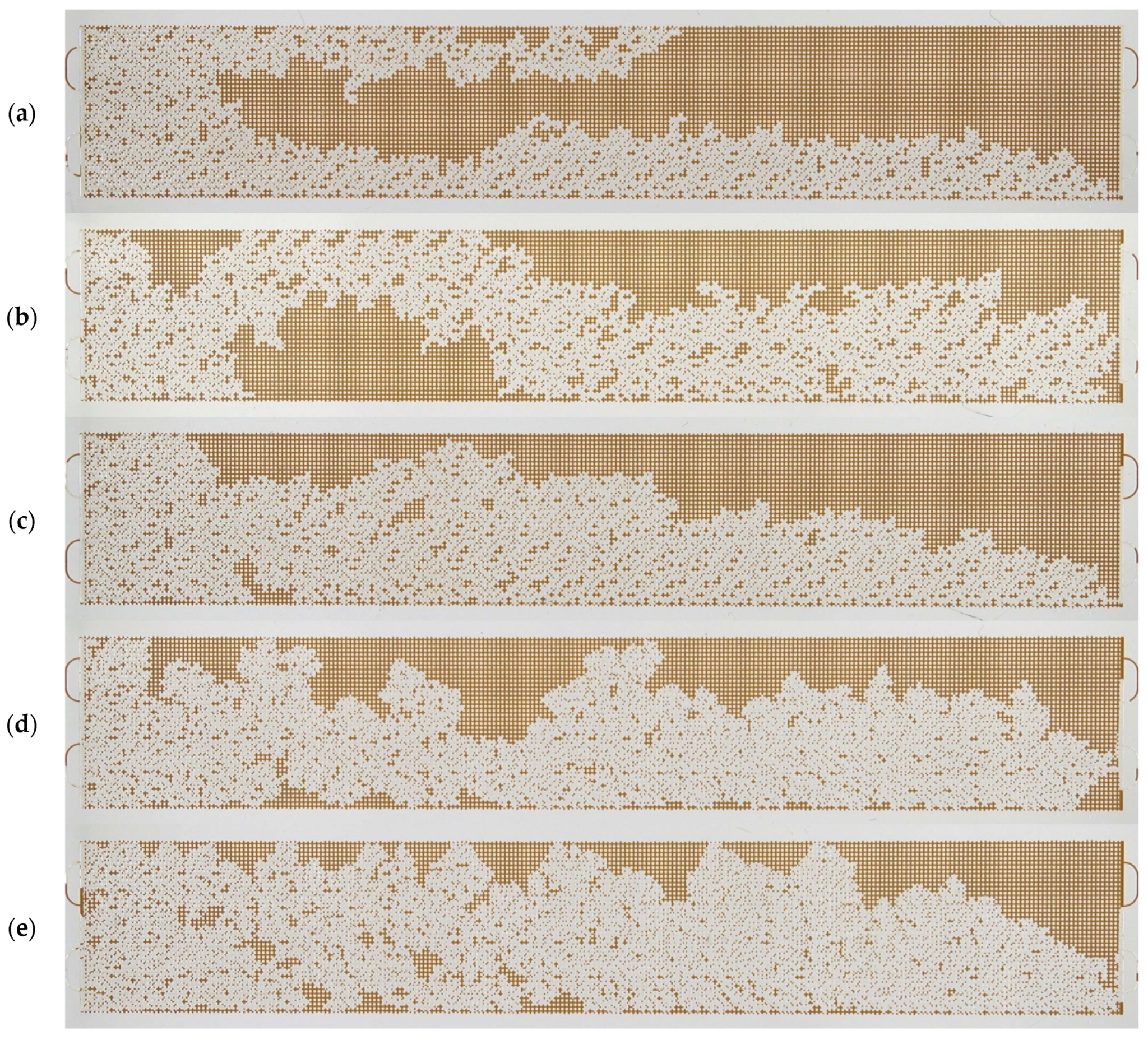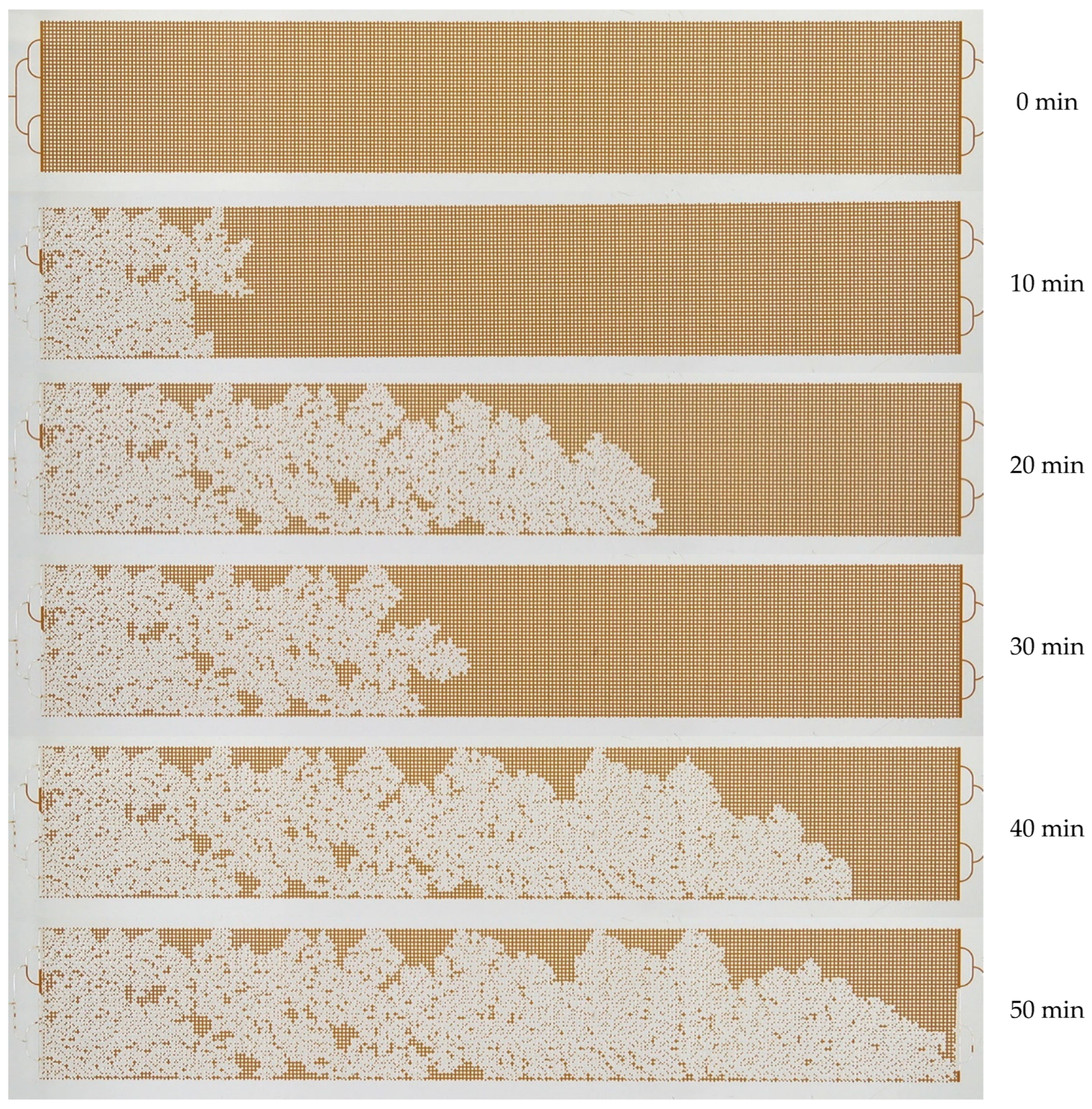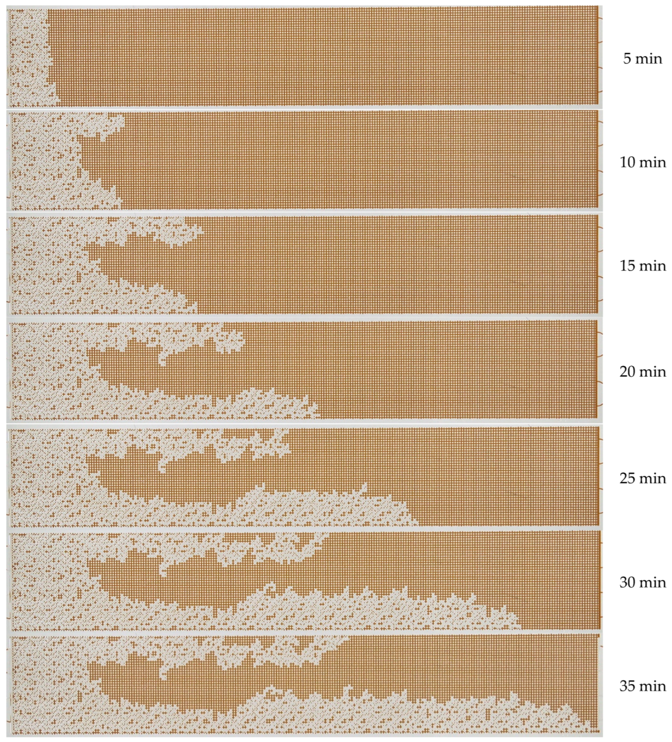 Figure 12 as a series of time-lapse images showing characteristic stages of front evolution. During the initial stage of the experiment, a uniform frontal advance is observed. As the process continues, however, front instability is recorded, leading to the formation of distinct branched structures—viscous fingers. The progressive branching of these viscous fingers results in premature breakthrough of the displacing agent at the model outlet and the formation of extensive zones of capillary-trapped residual oil. A detailed analysis of the viscous finger morphology reveals two dominant development mechanisms: capillary-dominated branching at the initial stage and viscosity-dominated fingering at later stages.