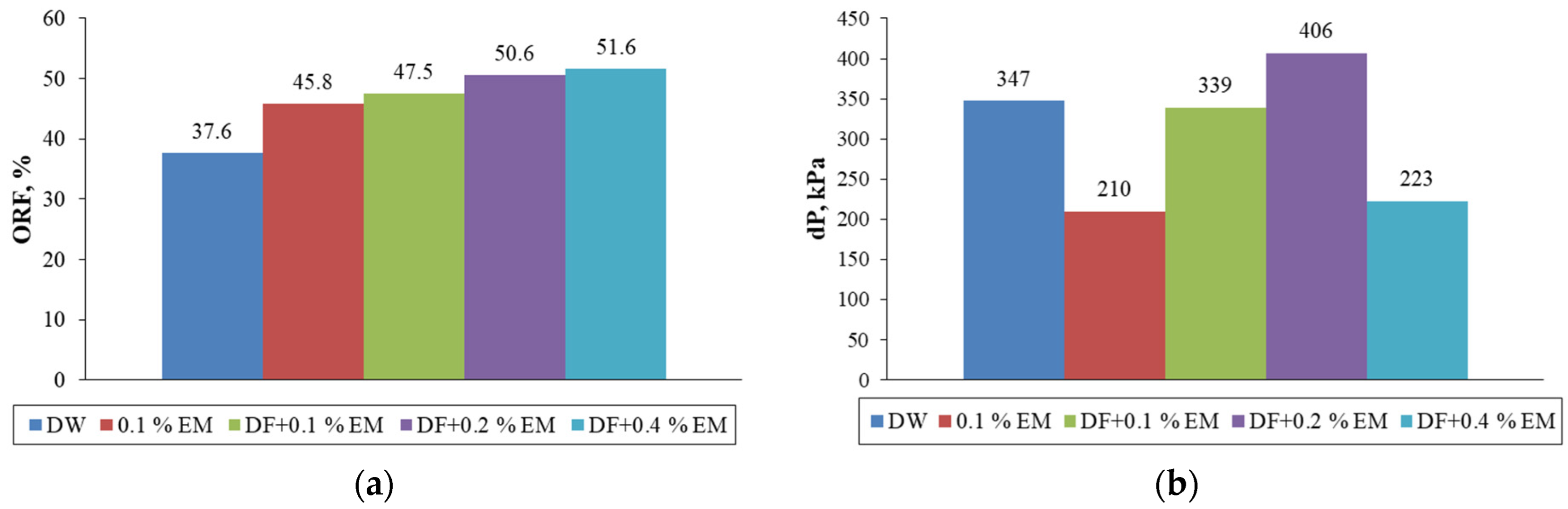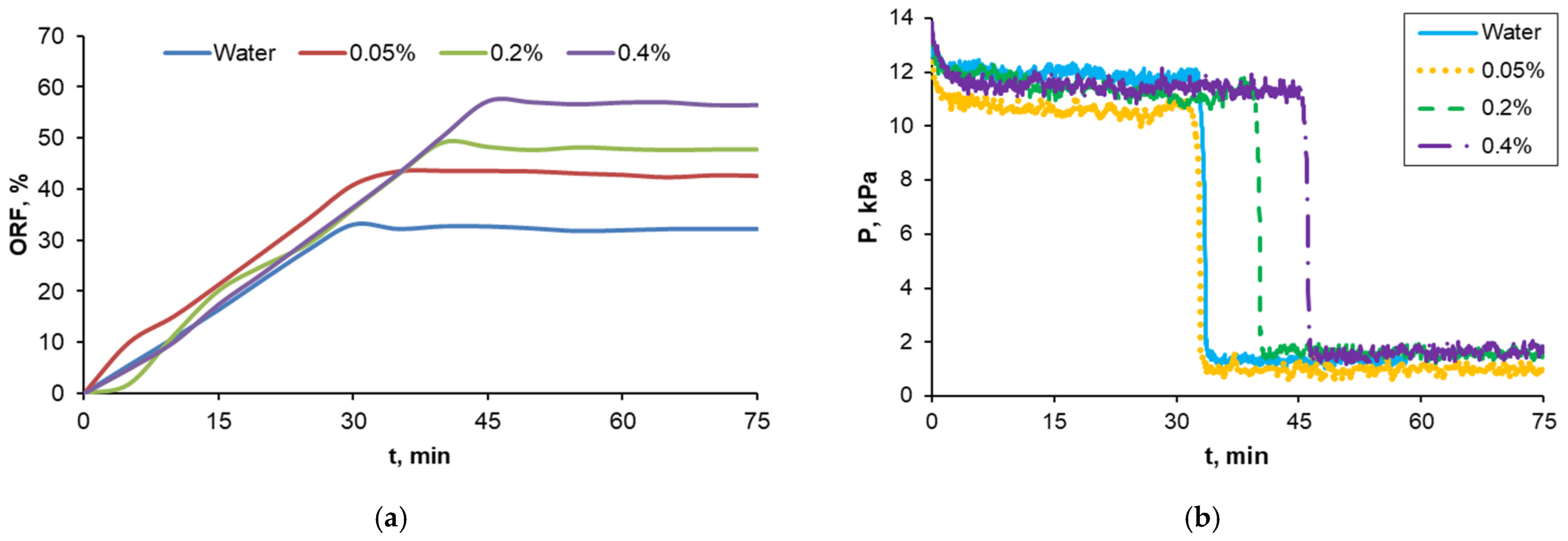 3.6. Filtration Experiments on Oil Recovery from Core Samples