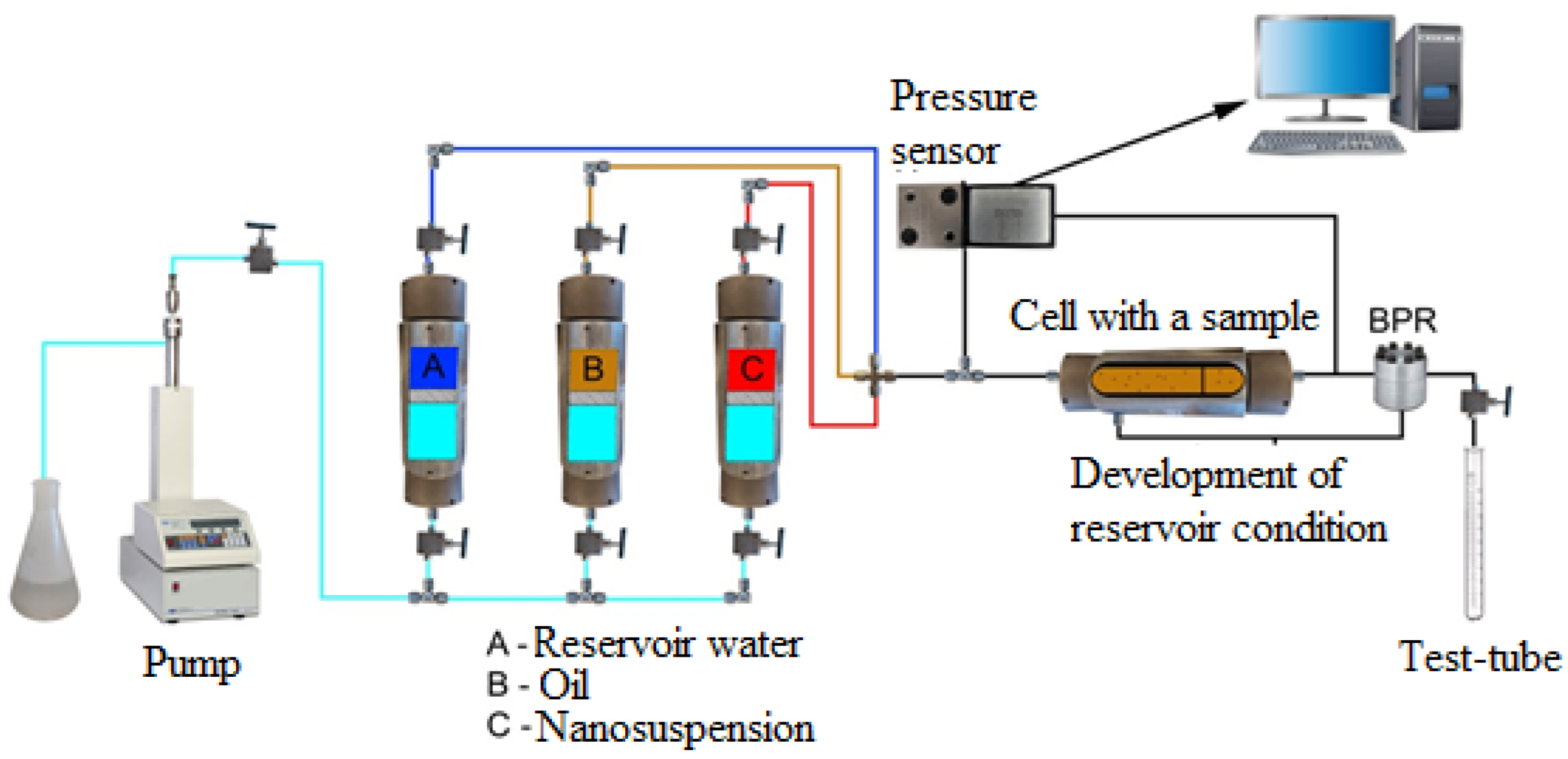 According to the results of studies of capillary impregnation and microfluidic experiments, 4 solutions were selected to determine the effectiveness of total EOR from core samples: an aqueous solution of emulsifier with a content of 0.1%, and emulsions with an addition of 0.5% diesel with an emulsifier content of 0.1, 0.2, and 0.4%. Filtration tests to determine the effectiveness of flooding rocks with nanoemulsion were conducted at a filtration plant UFS-200. UFS-200 is an automatic core flooding system, which is designed for two-phase displacement of liquids in an unsteady and stable state. The scheme of the filtration plant is shown in