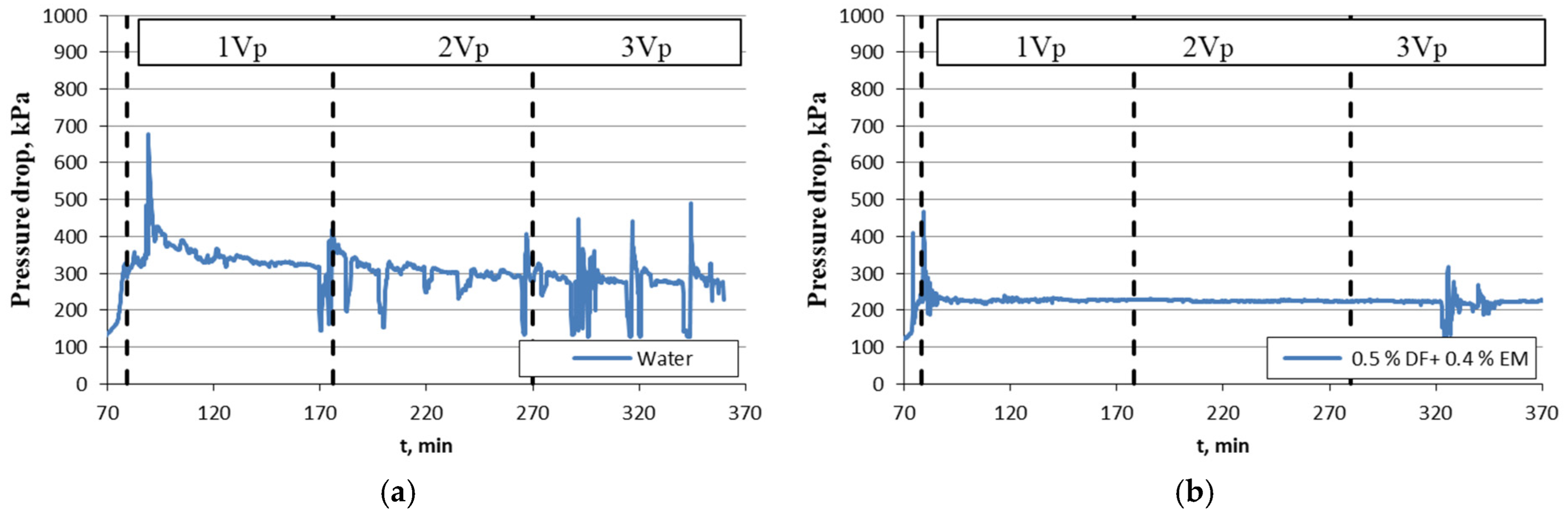 Figure 20b, with an increase in the concentration of the emulsifier, the pressure drop decreases. This phenomenon is due to the fact that the emulsifier addition reduces the IFT, which leads to a decrease in capillary pressure. Another important result obtained in our study is worth noting. Filtration studies of the effectiveness of emulsions on core samples have generally confirmed the results obtained by us during filtration studies on microfluidic chips. All the trends detected with the help of microfluidic chips were confirmed by core studies. This is a very important result, indicating that microfluidic research may be used for rapid assessments of the effectiveness of reservoir flooding fluids.