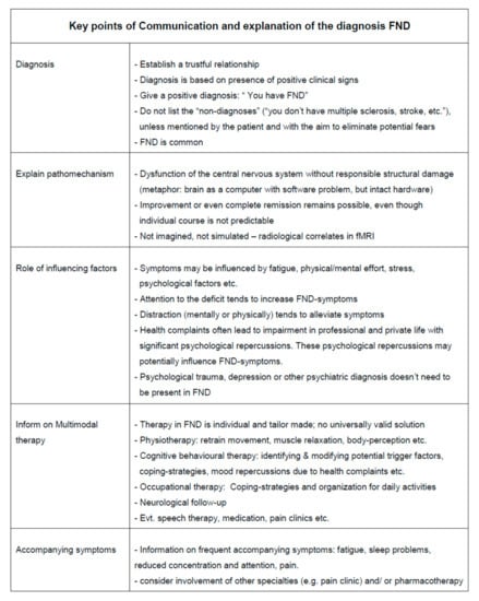 67]. Here, a neurologist and psychiatrist see the patient together in a longer consultation. The neurological examination takes place first, followed by a psychiatric interview. Later, in the joint consultation, the findings/diagnosis and treatment options are discussed, including the patient. Patients who had psychiatric treatment outside the joint consultation program often are not able to ameliorate their physical symptoms, suggesting that unspecific psychiatric intervention is not sufficient for FND patients [