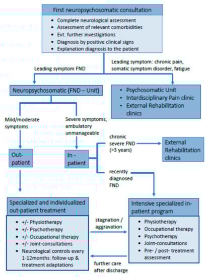 15]. In approximately 30% of the cases, out-patient treatment is organized at our FND Unit, especially for patients living in the direct vicinity or with complex semiology; in approximately 70% of the patients, interdisciplinary treatment is organized externally (patients living in geographically distant regions or with milder symptoms).