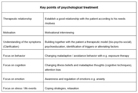 6]. We emphasize that psychological factors potentially influencing the symptoms are not necessarily trauma or for example severe depression, but also psychological stressors of daily life (e.g., stress at work). The impact of the current symptoms can also represent in itself a burden that required psychotherapeutic help. Nevertheless, discussing referral to psychotherapy often requires a trustful doctor–patient relationship and may not always be addressed during the early consultations. Individualized therapy is composed for every patient according to their symptoms and their biopsychosocial situation. Assessment of accompanying symptoms e.g., sleep disturbance, fatigue, pain, cognitive symptoms, and comorbid psychiatric symptoms is important and supportive drug therapy can be considered [