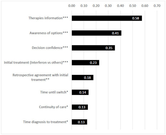 If patients would have retrospectively opted for the same DMT after their initial diagnosis correlated significantly with the satisfaction with the FDC (tau-b = 0.18, p = 0.008), the initial medication (not being interferon, tau-b = 0.23, p = 0.002), information on treatment options provided by the physicians (tau-b = 0.23, p < 0.001), and the confidence in treatment decision (tau-b = 0.21, p = 0.002).