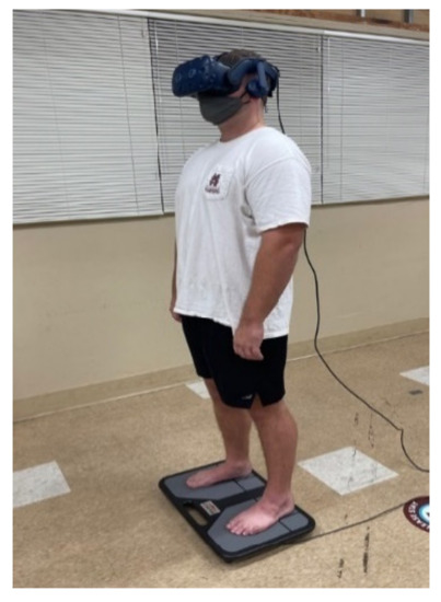 Static postural stability was measured with a BTrackS™ (Balance Tracking Systems, Inc., San Diego, CA, USA). BTrackS™ balance plate was validated against the force platform, which is considered the gold standard in assessing postural stability [41]. Required VEs were developed with Unity 3D and were delivered via an HTC Vive Pro™ (HTC America, Inc., Seattle, WA, USA) HMD (Figure 1). A lobby environment and a closed-room environment were the two VEs used in the study. The BTrackS™ (Balance Tracking Systems, Inc., San Diego, CA, USA) software performed an automatic self-calibration of its sensors at the beginning of each testing session, and a sampling rate of 25 Hz was set. The VR system was calibrated using the hand-held sensors to ensure the VEs were oriented in the correct direction and with the correct dimensions and boundaries of the room.
