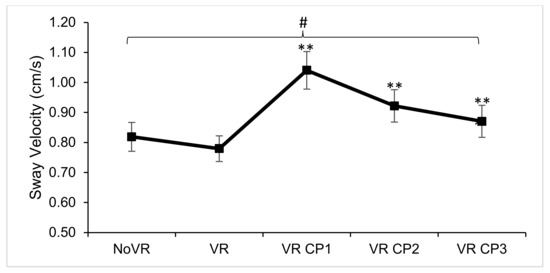 Sway velocity (cm/s) during upright bilateral stance with no virtual reality (NoVR), with virtual reality (VR), first trial in virtual environment with room walls closing in (VR CP1), second trial (VR CP2), and third trial (VR CP3). # represents main effect significance and * represent post-hoc pairwise comparison significance. Bars represent standard errors. ** implies significant difference from first two conditions.