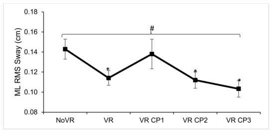 Medial lateral root mean square (ML RMS) sway (cm) during upright bilateral stance with no virtual reality (NoVR), with virtual reality (VR), first trial in virtual environment with room walls closing in (VR CP1), second trial (VR CP2), and third trial (VR CP3). # represents main effect significance and * represents post-hoc pairwise comparison significance. Bars represent standard errors.