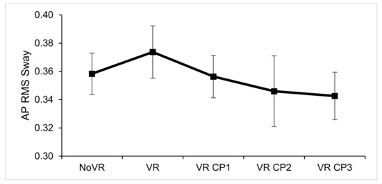 Anterior posterior root mean square (AP RMS) sway (cm) during upright bilateral stance with no virtual reality (NoVR), with virtual reality (VR), first trial in virtual environment with room walls closing in (VR CP1), second trial (VR CP2), and third trial (VR CP3).