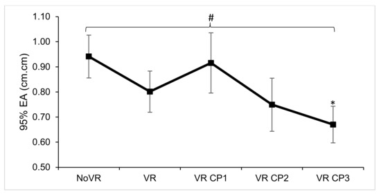 95% ellipsoid area (EA) (cm2) during upright bilateral stance with no virtual reality (NoVR), with virtual reality (VR), first trial in virtual environment with room walls closing in (VR CP1), second trial (VR CP2), and third trial (VR CP3). # represents main effect significance and * represents post-hoc pairwise comparison significance. Bars represent standard errors.