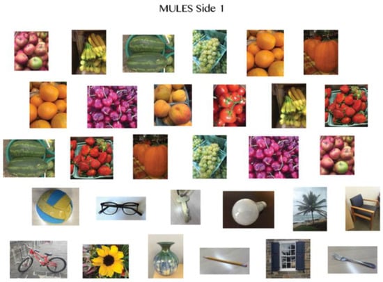 Rapid automatized naming (RAN) tests, utilized in neuropsychological studies since the early 20th century, are performance measures that consist of timed and scored letter, number, color, or picture/object identification [,,,,,]. As visually-based performance measures, RAN tests not only assess vision and eye movement behavior, but they also assess attention, cognition, and language. The results are impacted by dysfunction in any of these domains, as well as by factors such as fatigue, cooperation, and motivation. In concussion, the King–Devick (KD) test, a rapid number naming test, has been validated as a sensitive sideline measure for acute concussion detection. Post-concussion total test times increase (i.e., worsen) relative to pre-season baseline scores [,,,,]. More recently, the Mobile Universal Lexicon Evaluation System (MULES), a rapid picture naming test, has been developed [], studied in multiple neurologic disorders [,,,], and also shown to yield prolonged test times in individuals with a concussion [,]. The completion of the MULES test requires the naming of 54 color photographs of fruits, common objects, and animals in context (Figure 1) as rapidly and accurately as possible. The addition of vision-based rapid automatized naming (RAN) tests may improve the sensitivity of concussion detection [].