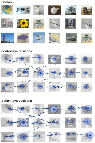 All participants completed a computerized version of the MULES test while simultaneously undergoing binocular eye movement recordings. The MULES test consisted of three screens (screen dimensions: width 53 cm × height 30 cm; distance between screen and participant: 75 cm) with a series of 18 pictures per screen arranged in a 3 × 6 grid for a total of 54 pictures to be named (Figure 2, top). The MULES test was digitized and computer-generated via custom MATLAB software to display the same pictures that comprise the ‘paper and pencil’ version of the MULES test, with the same ordering and relative spacing on each line. The images were separated into three sets instead of the two sets displayed on the laminated flip cards of the ‘paper and pencil’ version of the MULES test [] to maximize image sizes on the computer monitor. Each screen of images was preceded by a central fixation circle, which they were required to fixate on for 1 s before the screen with the picture images was displayed to standardize the starting position of the eye across individuals and ensure that their attention was directed to the screen. Participants were instructed to name each picture as rapidly and accurately as possible starting at the upper left image and naming the images from left to right and top to bottom. The total digitized MULES time in seconds elapsed while naming the pictures (excluding time between screen changes) was recorded.