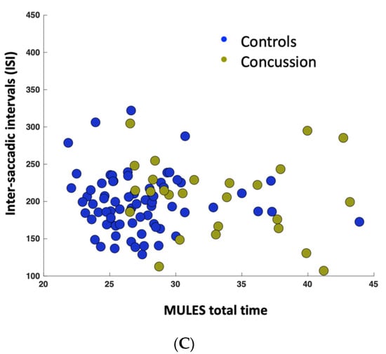 There was a significant correlation (Figure 4A) between longer (worse) MULES times and increased numbers of saccades in both groups (r = 0.46, p = 0.026 and 0.63, p = <0.00001 in control and concussion history, respectively). There was also a significant correlation (Figure 4B) between ISI and the number of saccades in both groups (r = −0.62, p = 0.0016; r = −0.46, p = 0.00078 for control and concussion groups, respectively). No significant correlation was observed between the MULES times and ISI in either group (Figure 4C).