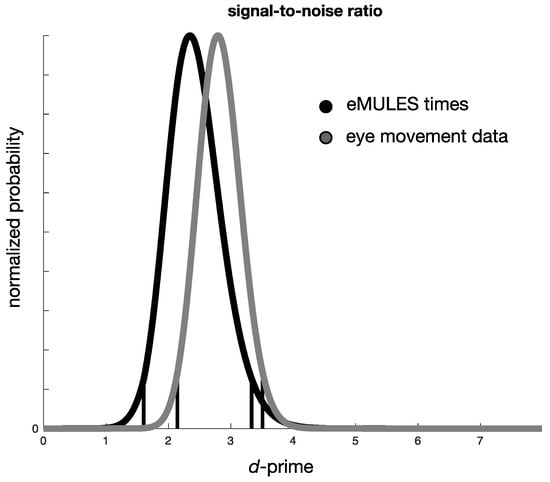 Posterior distributions over the d-prime (discrimination) measure based either on MULES times or eye movement data. The two curves represent d-prime computed based on either MULES times or eye movement data, where d-prime indicates the signal-to-noise ratio of discriminating concussion from control data.