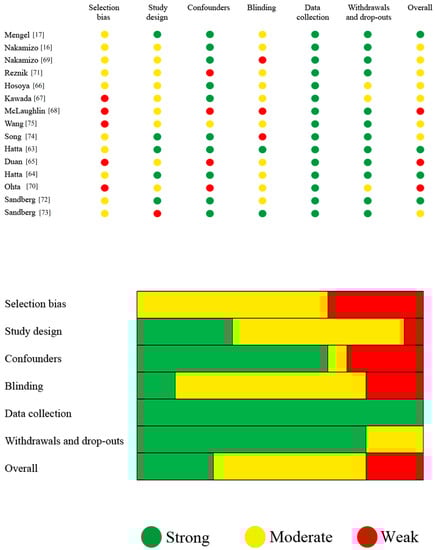 The EPHPP scores for each selected study are detailed in Figure 2 (upper panel). Following the EPHPP quality criteria, four studies received a strong rating [17,63,64,72], eight studies a moderate rating [16,66,67,69,71,73,74,75], and three studies a weak rating [65,68,70]. The main weakness of the studies included in this systematic review was the presence of a selection bias in the collection of the study sample; in fact, none of the studies showed a strong score in this component. A proper study design was observed only in five studies. Other frequently observed weaknesses of the selected studies included the lack of blinding of delirium assessors or patients (13 studies) and the lack of controls for possible confounders (5 studies).