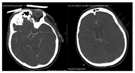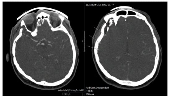 AIS patients with identified thrombotic vessel occlusion without infarction demarcation confirmed on an admission head CT and CT angiography scan and initial NIHSS (National Institutes of Health Stroke Scale) [12] >4 were presented for treatment with MT and included in this study. AIS patients with infarct demarcation or intracerebral hemorrhage on admission CT scan, and those with an initial NIHSS score <4 were excluded. Intravenous bridging thrombolytic therapy with rtPA (0.9 mg/kg of body weight) was administered in case of no contraindications. The intervention was performed under general anesthesia. On Day 1, we performed a control head CT scan. An unbiased senior radiologist (P.K.) performed the radiographic analysis. CT angiography scans at admission were divided into groups with pial arterial collateralization (Figure 1) and without pial arterial collateralization (Figure 2), depending on the presentation of the peripheral arterial contrast filling of the affected vessel territory on the CT angiography scan upon admission. Using thrombolysis in the cerebral ischemia (TICI) [13] score, he assessed the recanalization rate. For the postinterventional CT scan analysis, we used the modified 1/3 MCA score [14]. The patients were divided into three groups: those with major infarction occupying more than 1/3 of the affected vessel territory, patients with minor infarction occupying less than 1/3 of the affected vessel territory or basal ganglia, and those without any infarction. Depending on the intracerebral hemorrhage (ICH) volume on the Day 1 head CT scan, we divided the patients into three groups: those with major ICH occupying more than 1/3 of the affected vessel territory, those with minor ICH occupying less than 1/3 of the affected vessel territory, and those without any ICH. Clinical outcome was evaluated based on the NIHSS score at discharge, with NIHSS 0–4 defined as a good outcome, as well as NIHSS improvement (NIHSS at admission minus NIHSS at discharge). In radiographic outcomes, we looked for major and minor ICH as well as major and minor infarction on Day 1 CT scan.
