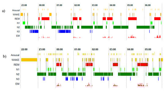A well-replicated finding in patients with insomnia is an increase in micro-arousals during sleep. Regarding this, an important role for a disturbance of REM sleep (either termed REM sleep instability or restless REM sleep) has been postulated [,] regarding the pathophysiology of insomnia and, in particular, for the altered perception of sleep and the inability to down-regulate hyperarousal. For the first time, this was highlighted in 2008 by Feige et al. []: in this study, 100 good-sleeper controls and 100 patients with ID were investigated for two nights in a drug-free state with routine polysomnography in a sleep laboratory. The analysis of night 2 (termed baseline), besides looking at routine parameters of sleep continuity, sleep architecture and REM sleep, included scoring of micro-arousals during all stages of sleep (for an example, see Figure 2).
