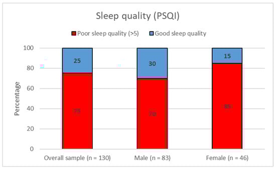 Figure 1 illustrates the percentages of employees reporting good and poor sleep quality (PSQI global score > 5). The majority of employees (75%) reported poor sleep quality. Sleep quality category was not significantly associated with gender (X2 = 3.52, p = 0.06), and the majority of both males (70%) and females (85%) reported poor sleep quality.