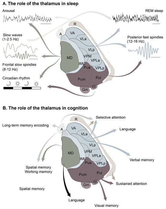 The functions of the thalamus. (A) The role of the thalamus in sleep. (B) The role of the thalamus in cognition. Abbreviations: A—anterior, CL—centrolateral, CM—centromedial, ET—eminentia thalami, Gl—lateral geniculate, Gm—medial geniculate, IL—intralaminar, LD—laterodorsal, M—medial, MD—mediodorsal, PF—parafascicular, Pua—pulvinar anterior, Pul—pulvinar lateral, Pum—pulvinar medial, R—reticularis, VA—ventral anterior, VLa—ventrolateral anterior, VLp—ventrolateral posterior, VPLa—ventroposterolateral anterior, VPLa—ventroposterolateral posterior, VPM—ventroposteromedial. Parcellation adapted from Carrera [31].