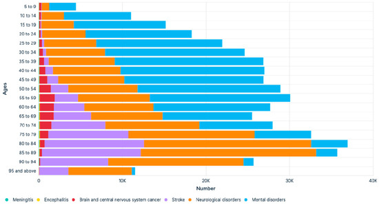 The disability related to brain disorders in Switzerland in 2021. The disability, as expressed in the years of healthy life lost (DALYs), due to different brain disorders varies across the life course and reaches the highest value at the age of 80–84 (data from the “Brain Health Atlas”, https://brainhealthatlas.org (accessed on 12 October 2023)). Noteworthy, in this representation, stroke, meningitis/encephalitis, and brain/central nervous system cancer are listed separately from other neurological disorders.