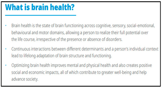 On 9 August 2022, the WHO presented the position paper “Optimizing brain health across the life course”. It proposed a new definition (Figure 3) [4].