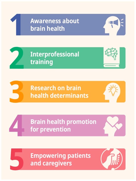 - Rost, N.S.; Salinas, J.; Jordan, J.T.; Banwell, B.; Correra, D.J.; Said, R.R.; Selwa, L.M.; Song, S.; Evans, D.A. The Brain Health Imperative in the 21st Century-A call to action. Neurology 2023, 101, 1–10. [Google Scholar] [CrossRef]