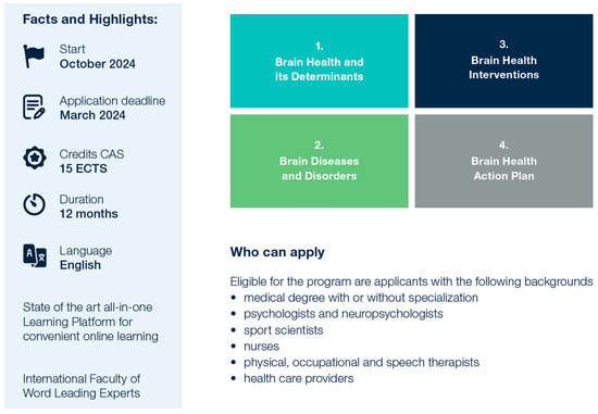 The education and training of physicians, nurses, and other health professionals should emphasize the importance of brain health and raise awareness, knowledge, and understanding about the burden of brain disorders (NDs/MDs). New and dedicated tools to promote cross-disciplinary interprofessional education should be developed. A certificate of Advanced Studies (CAS) on Brain Health will be launched by the University of Bern in Fall 2024 (see below).