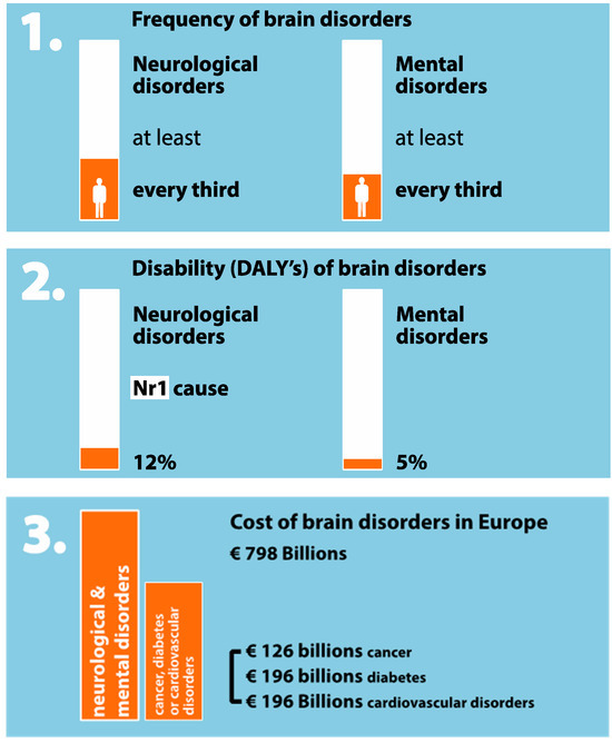 The key role of a healthy brain in our life stands in contrast to the limited awareness among the public and health professionals regarding the very high burden of brain disorders (see Appendix A.1), the growing possibilities to diagnose, treat, rehabilitate, and prevent them, and the opportunities to promote brain health and resilience throughout the entire lifespan [2,3,4]. Brain disorders, both MDs and NDs, affect millions of people worldwide. According to the World Health Organization (WHO), and recent peer-reviewed publications, more than one in three persons are affected by a ND and at least one in three are affected by a mental (psychiatric) disorder (MD) [3,4,5,6].