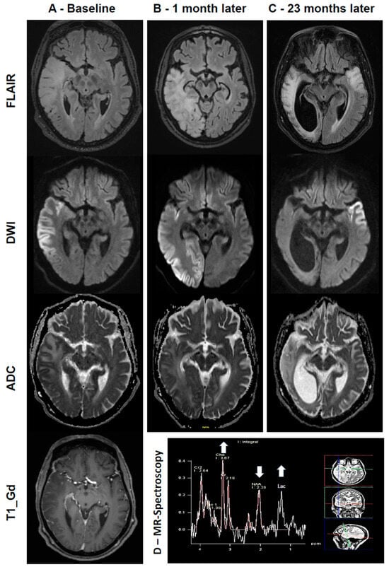 (A) Brain MRI at first presentation (baseline). Top: the T2-weighted image (FLAIR) shows an extensive cortical/subcortical hyperintense lesion in the right temporal and parietal lobes. Upper and lower middle: DWI and ADC maps reveal an increase in DWI signals and a reduction in ADC values in the right temporoparietal cortex, suggesting cytotoxic edema, but an increase in ADC values in the underlying subcortical white matter, suggesting vasogenic edema. Bottom: the T1 gadolinium-enhanced image shows mild gyral contrast enhancement in the right temporal and parietal lobes. (B) Brain MRI at 1 month. Progression and expansion to the right occipital lobe (top: FLAIR; middle: DWI; bottom: ADC). (C) Brain MRI at 23 months. Chronic cortical/subcortical lesion on the right side with an associated marked ex vacuo dilatation of the right lateral ventricle. A new hyperintense FLAIR/DWI signal in the left temporal lobe (top: FLAIR; middle: DWI; bottom: ADC). (D) MR spectroscopy shows low N-acetyl aspartate (NAA) and high choline and lactate peaks in the right temporal lobe.