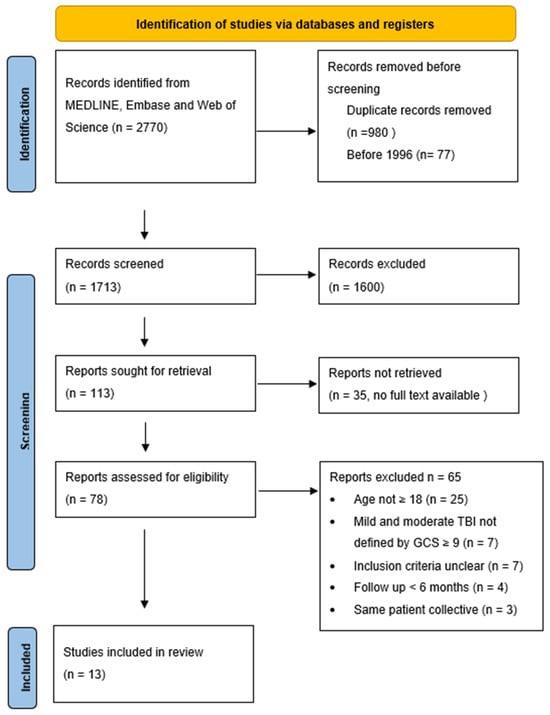We identified 2770 records, of which 1713 were screened and 78 retrieved for full Text screening. We identified 13 studies that were eligible, with a total of 22,550 patients (Figure 1). Hereof 22,007 patients (97.6%) had mild TBI and 543 patients (2.4%) had moderate TBI.