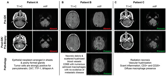 (A–C) MR imaging of three example patients (Patients A–C) depicting lesions on both T1 with contrast (T1 + C) and minimum intensity projection (mIP) both pre-radiation treatment (Pre-GK) and post-radiation treatment (Post-GK/Pre-Biopsy) are shown. The presence or absence of CVS is indicated on each of the mIP images, along with the corresponding diagnosis on histology.