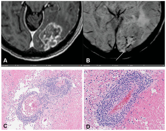 To understand the biological relevance of the CVS in the context of post-RT disease, we retrospectively identified patients whose records indicated that there was residual fixed tissue available for additional histologic staining. Of these, 9 had sufficient tissue for processing and staining steps as determined by our Pathology Department. We found that, regardless of diagnosis of RN or TP, patients with a CVS (Figure 2A,B) had a corresponding presence of perivenular immune infiltrate (Figure 2C,D). This immune infiltrate was not present in patients without CVS. Hematoxylin and Eosin-stained slides showed stigmata of radiation-induced changes, such as vascular hyalinization, necrosis, and/or the presence of a few residual tumor cells. Immunohistochemical stains highlighted individual cell types and demonstrated the presence of leukocytes (CD45) (Supplementary Figure S3A), T-lymphocytes (CD3) (Supplementary Figure S3B), and macrophages (CD68) (Supplementary Figure S3C), or in a diffuse intraparenchymal distribution pattern and occasionally as small perivascular accumulation (Supplementary Figure S3D).