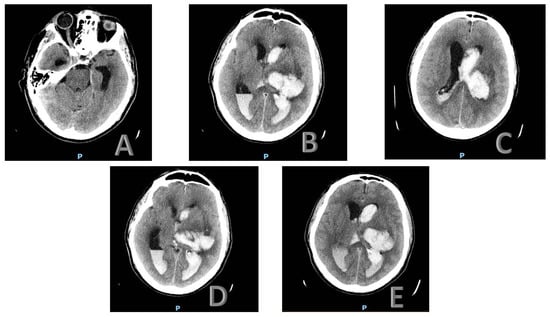 Upon reassessment a few days later, following a new brain CT scan, the intraparenchymal hemorrhage remained stable, localized in the left nucleus-capsular region and extending to the corona radiata and semioval center. However, the perilesional edematous halo had slightly increased, resulting in a modest worsening of the contralateral midline shift, now estimated at approximately 9 mm. The subarachnoid hemorrhage in the right parietal region remained unchanged, while a slight reduction in the intraventricular hemorrhage volume was observed, particularly in the fourth ventricle (Figure 1A–E).