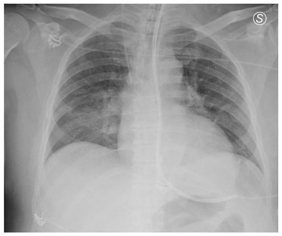 The patient remained mechanically ventilated and was fed via a nasogastric (NG) tube. On the tenth day of ICU admission, the advanced state of coma persisted [GCS 3—E(1) V(NT) M(2)], with miotic, isocoric, and isocyclic pupils that were weakly reactive to light stimulation. Neurological examination revealed the presence of bilateral corneal reflexes, a cough reflex, a preserved doll’s eye reflex, and an indifferent plantar reflex. An electroencephalogram (EEG) performed during this period showed increased slow-wave activity without irritative elements. A few days later, a new chest X-ray was performed due to elevated inflammatory markers. The imaging confirmed the presence of the NG tube, with its distal end projecting into the likely location of the gastric body. Additionally, an area of pulmonary hypodiaphany was identified in the right middle lung field (Figure 2).