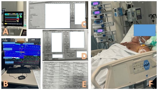 The professional environment of a physiatrist in the Intensive Care Unit (ICU). The patient is continuously monitored using multiparametric systems. One monitor (A) displays vital signs, while another (B) provides more detailed parameters, such as mean blood pressure, electrocardiographic tracings, and capnometry. The medical record (C,D) includes vital sign trends recorded at different times of the day, details on device placements (e.g., bladder catheter, tracheostomy, or percutaneous gastrostomy), results of instrumental tests, and key scores such as the GCS and Acute Physiologic Assessment and Chronic Health Evaluation (APACHE). Adjacent to the medical record is the nursing record (E), updated three times daily, which documents the patient’s consciousness level, hemodynamic status, temperature, diuresis, and administered medications. The patient (F), sedated and positioned on a specialized bed with an anti-decubitus mattress, is connected to a mechanical ventilator and fed via an NG tube. Various devices, including syringe pumps and positive pressure infusion pumps, ensure precise drug administration in terms of volume and rate—critical for medications like adrenaline, noradrenaline, and dobutamine that require exact dosing due to their significant physiological effects.
