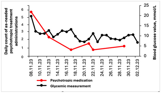 Figure 1. Evolution of blood glucose levels (mmol/L) and daily as-needed psychotropic medication administrations during hospitalization. As-needed treatment consisted of either clomethiazole 192 mg or clonazepam 0.5 mg. Although the Pittsburgh Agitation Scale score is not depicted in the graph, the reduced frequency of psychotropic medication administration reflects its improvement, which began between November 12 and 14, coinciding with the stabilization of glycemia.