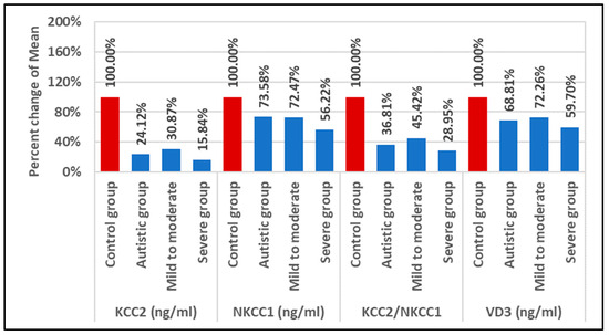 The percent change for the three measured variables, KCC2, NKCC1, and vitamin D3 levels, was significantly lower in individuals with ASD compared to healthy controls (p < 0.001) (Figure 1).