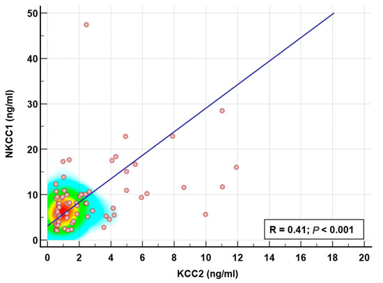 Spearman rank correlation coefficient (R) between KCC2 (ng/mL) and NKCC1 (ng/mL) with best-fit line curve (positive correlation, R = 0.41 and p < 0.001). Graphic representation using linear regression and heat map.