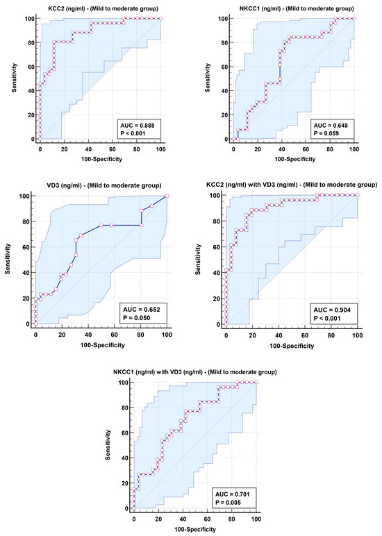 Combining ROC of NKCC2 and vitamin D3 remarkably improves the predictive diagnostic value of both variables; it records a combined AUC of 0.701 in the mild–moderate group of autistic patients and 0.823 in the severe group.