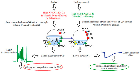 Diagram showing how vitamin D insufficiency or deficiency, changes in NKCC1 and KCC2, and the excitatory action of GABA may contribute to seizures and sleep disturbance in people with ASD, in comparison to healthy controls.
