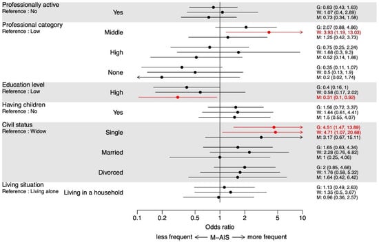 In the adjusted multivariable logistic regression analysis without interactions, an association was found between civil status and M-AIS. Patients who were single had greater odds of an M-AIS than widowed patients (OR 4.51, 95% CI 1.47–13.89). In the interaction analysis between gender-related variables and administrative sex, this association was significant in women (OR = 4.71, 95% CI 1.07–20.68), but not in men. Women in the middle professional category had greater odds of an M-AIS than women in the low professional category (OR = 3.93, 95% CI 1.19–13.03). Men with higher education had lower odds of an M-AIS than men with lower education (OR = 0.31, 95% CI 0.10–0.92). However, there were no statistically significant differences between the associations in men and in women (no significant interaction terms) (Figure 1).