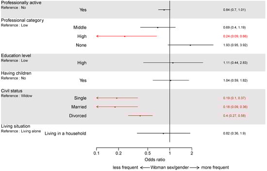 We extracted six socioeconomic variables from the patients’ medical charts (civil status, living situation, education level, professional categories, being professionally active and having children). We could thus cover several aspects of the four dimensions of gender: role dimension (professional categories, having children), the relation dimension (civil status, living situation) and the institutionalized dimension (education level) []. There was no information on the gender identity dimension. There is good evidence that these variables interact with gender and can thus be used as indicators of gendered SEP [].