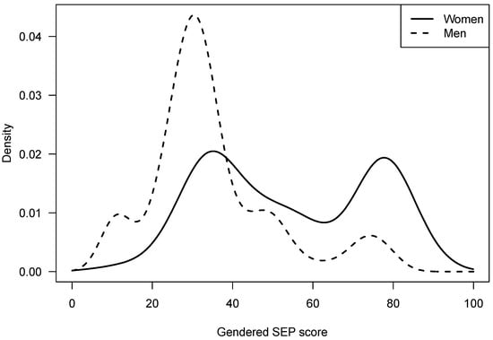 Distribution of the gendered socioeconomic position score for women and men calculated via kernel density estimation.