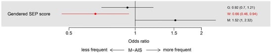 Logistic regression analysis of the probability of an M-AIS on the gendered socioeconomic position score; The reported odds ratios refer to a 20-unit increase in the score. Abbreviations: G = Global (no interactions), W = Women (model with interactions between the gendered SEP score and administrative sex), M = Men (model with interactions between the gendered SEP score and administrative sex).
