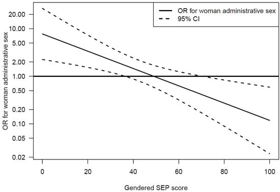 In the overall adjusted model, the gendered SEP score was not significantly associated with an M-AIS. However, analyses including interaction with administrative sex revealed statistically significant differences between women and men. For women, having a higher gendered SEP score was associated with lower odds of an M-AIS (OR 0.66, 95% CI 0.46–0.94). For men, the association was inversed, i.e., having a higher gendered SEP score was associated with higher odds of an M-AIS (OR 1.52, 95% CI 1.00–2.32, p-value = 0.051; interaction coefficient 0.43, 95% CI 0.25–0.74) (Figure 4). Another way to look at these results is to compute the OR of administrative sex for predicting M-AIS, at different score values: being in the woman category increased the odds of an M-AIS for small values of the score and lowered these odds for high score values (Figure 5).