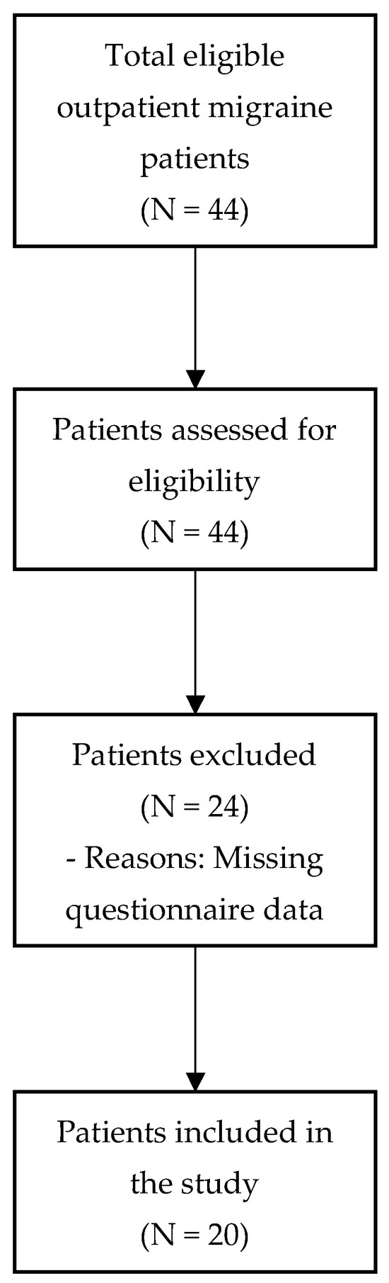 The present study has several strengths. The data were assessed prospectively using validated and reliable measurement tools to ensure the validity and accuracy of the collected data. It also allowed for comparison with the existing headache literature. The questionnaires were quick and easy to fill out. However, although we know from previous research that migraine is two to three times more prevalent in women [29,30], we cannot generalize the results to men and are limited in generalizing to the broader population of women with migraine due to the small sample size of 20 women. No headache days were included in this study because insufficient data were available. However, we think this limitation has a minor impact since we show improvement in migraine-related burden and a reduction in migraine-related disability, which, from patients’ perspective, might be more relevant. In addition, no acute and/or prophylactic medication use was considered, and as such, no isolation of the effects of the headache management program from the effects of drug management took place. Additionally, there was no control group for comparison, a major limitation of this study.