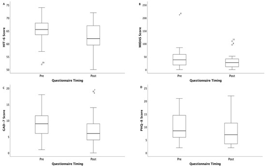 Decline in questionnaire scores before and after the headache management program. The box plots show the median (P50), interquartile range (Q1 to Q3), whiskers (minimum and maximum values within 1.5 times the interquartile range), and outliers: (A) HIT-6, Headache Impact Test; (B) MIDAS, Migraine Disability Assessment; (C) GAD-7, Generalized Anxiety Disorder; (D) PHQ-8, Patient Health Questionnaire.