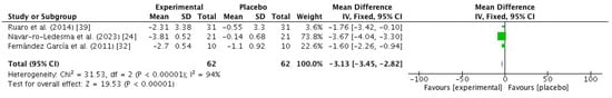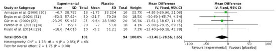 | Ergün et al. (2020) [31] | FM patients = 60 PBMT = 30 Placebo = 30 | NTP | Pre/post PBMT: 13.4 + 2.4/7.1 + 4. Pre/post placebo: 13.1 + 1.9/7.6 + 3.8 |